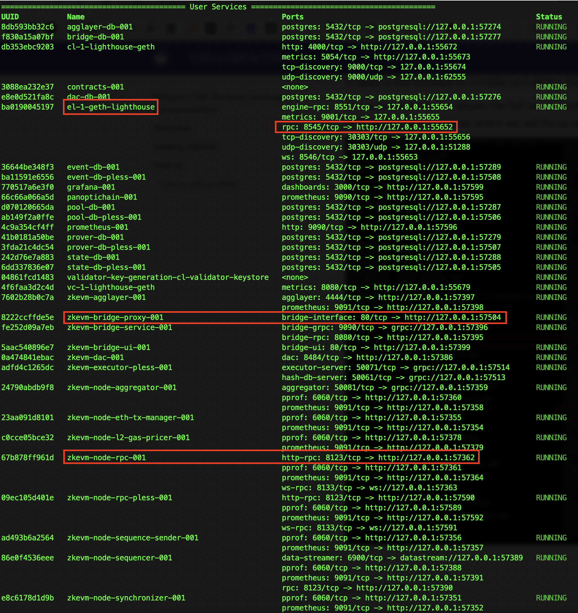 The screenshot below shows the full set of deployed services and highlights the bridge UI, L1 RPC, and L2 RPC services which we will focus on throughout this document.