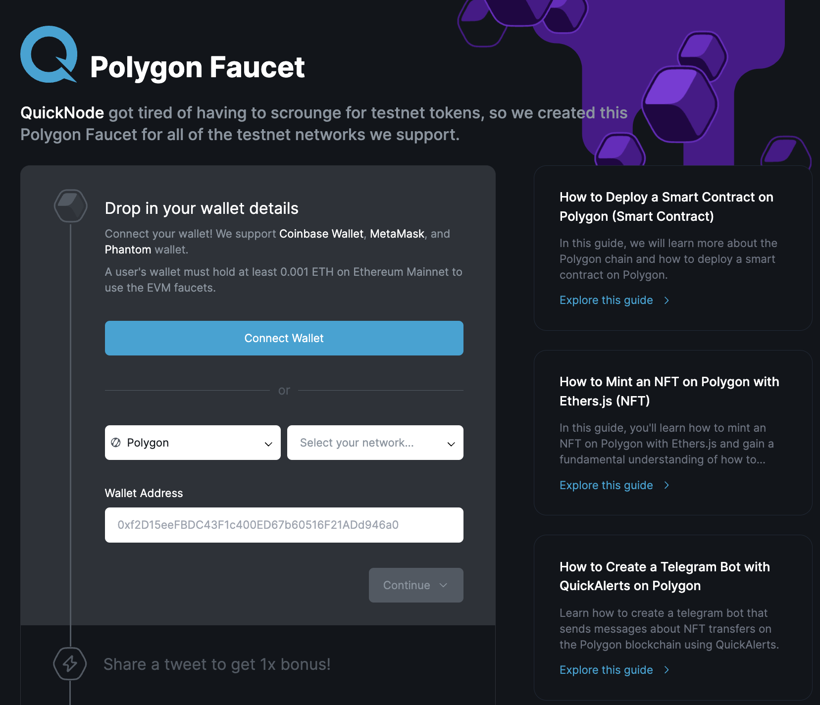 Head over to the QuickNode Polygon Faucet. Connect your Coinbase, MetaMask, or Phantom wallet by clicking on Connect Wallet. Then, choose Amoy, and finally select Continue.