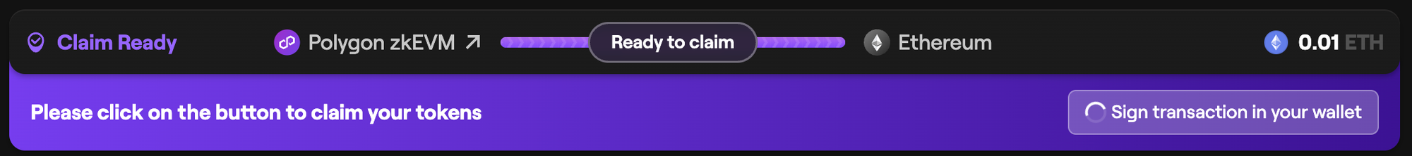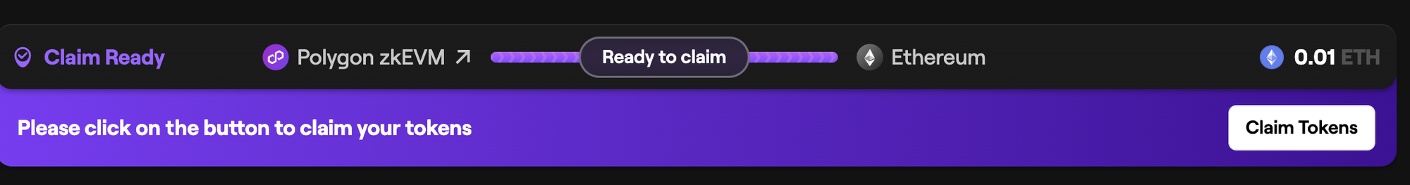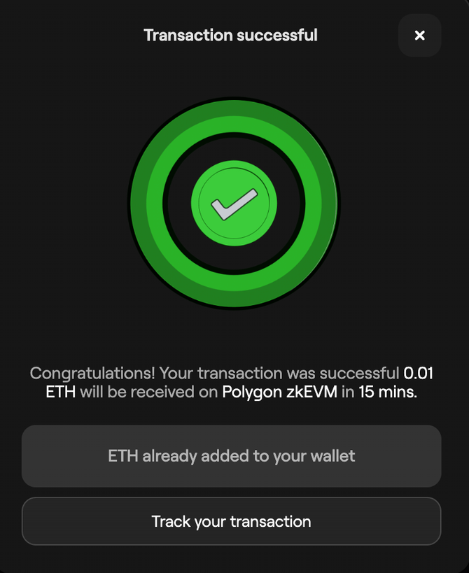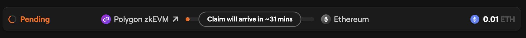 Your tokens transferred from Polygon zkEVM to Ethereum will generally be available to claim in 30-45 minutes. You can track the transaction status on the "Transactions" page.