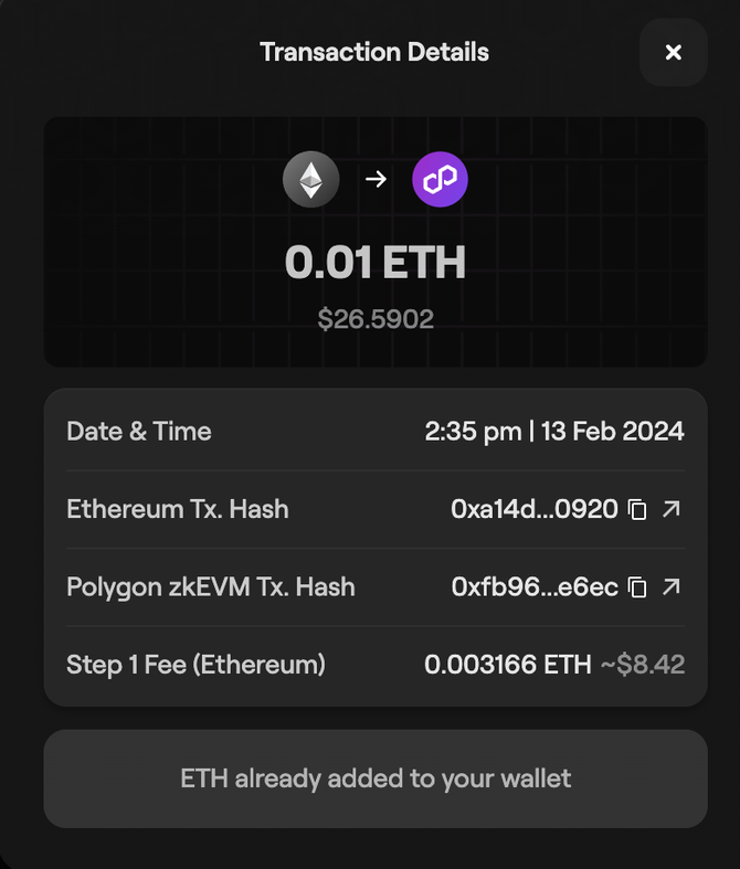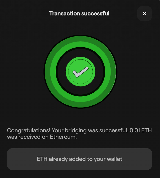 Once you sign the transaction successfully, the bridged tokens will be sent to your wallet, which your wallet balance will reflect shortly.