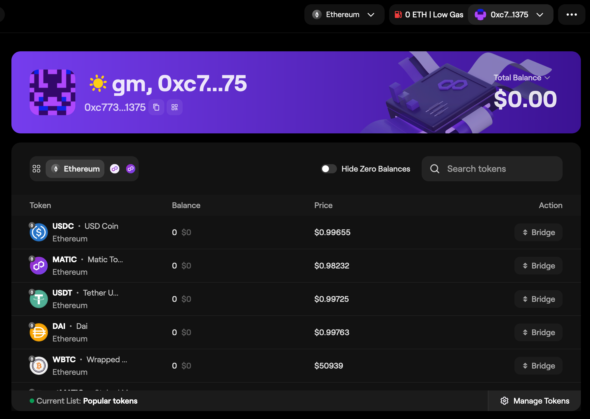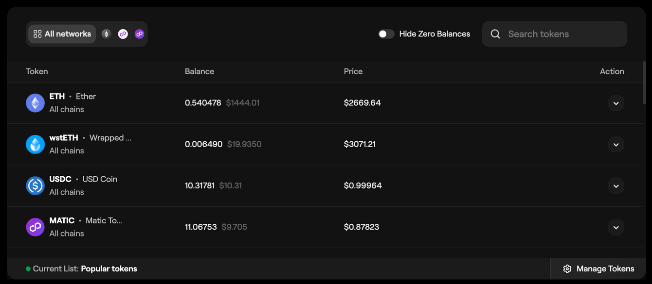 Once you approve the connection in your wallet, you'll be able to view your asset balances across Ethereum and Polygon chains.