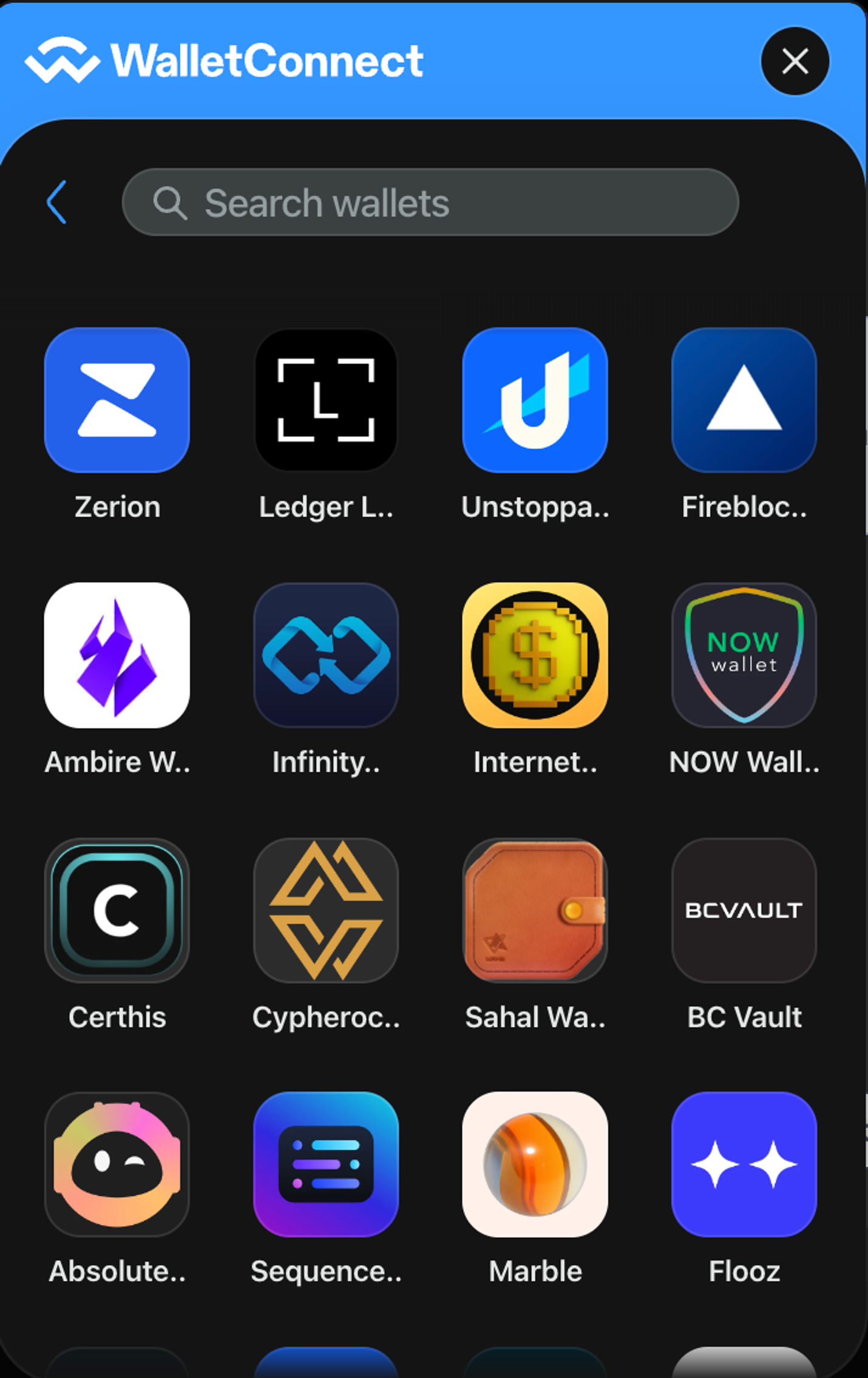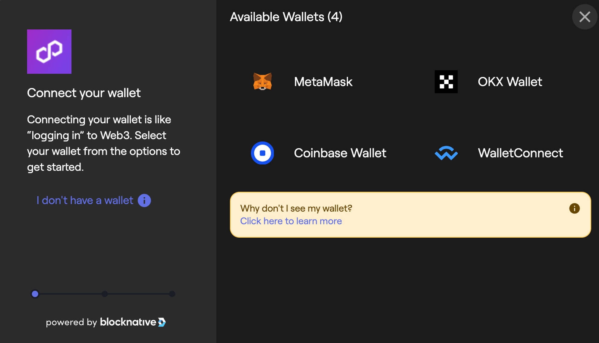 Click on the Connect Wallet button to bring up the blocknative wallet connect window.