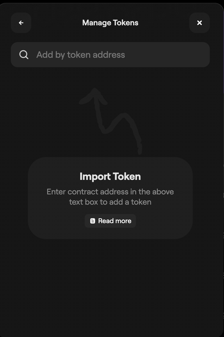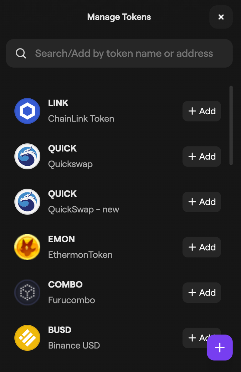 If your token doesn't appear in the search results, you can also add the token manually by selecting the + in the bottom-right of the Manage tokens window.