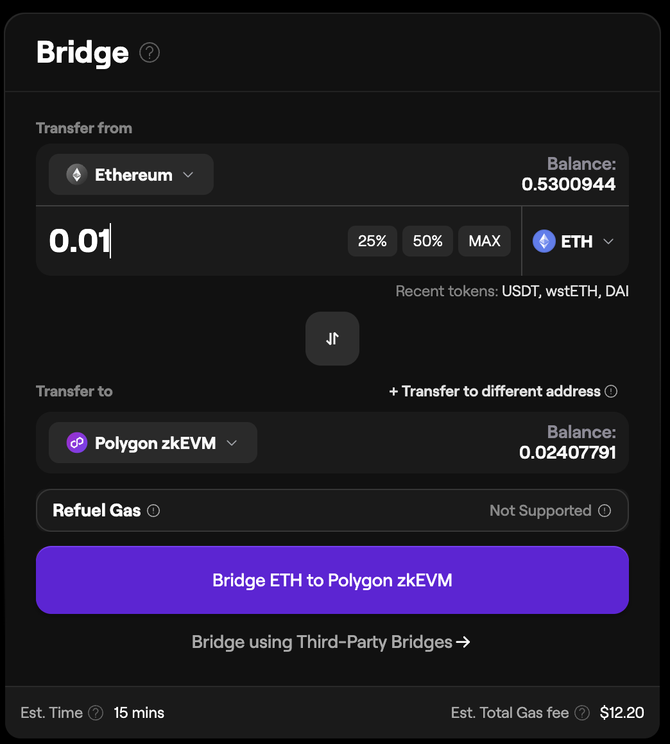 Once you see the bridge widget on your main screen, input the source and destination chains.For instance, if you were transferring tokens from Ethereum to Polygon zkEVM, select the following options.
