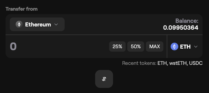 Enter the transfer amount for your selected token either manually, or by selecting a percentage of your current balance.