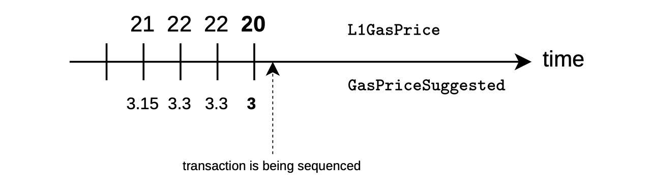 As seen in previous examples, the figure below displays L1 gas prices above the timeline, while the associated suggested L2 gas prices are shown below the timeline.