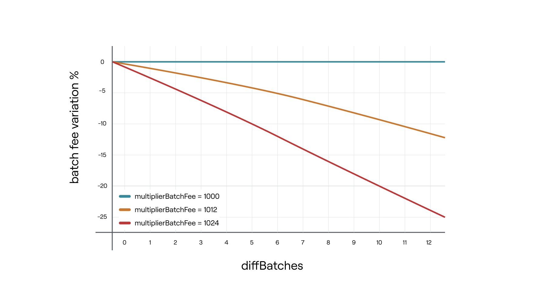 The graph below shows the percentage variation of the batchFee variable depending on the diffBatches value for different values of multiplierBatchFee when batches below the time target dominate the sequence. It should be noted that the goal is to reduce the aggregation reward.