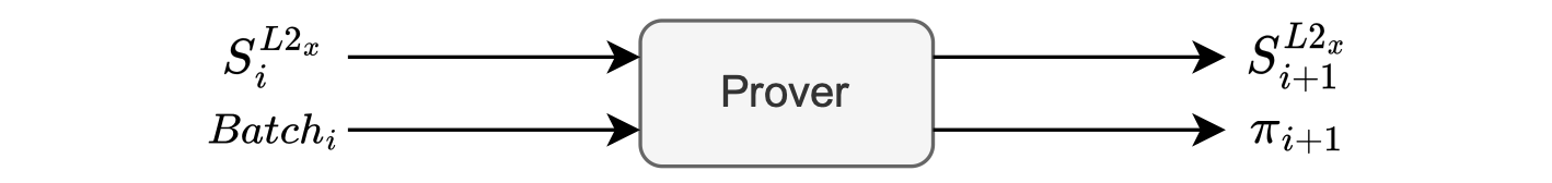 On a high level, the prover takes the last batch and the current state as inputs in order to calculate the new state, together with a proof that attests to the computational integrity of the state transition.
