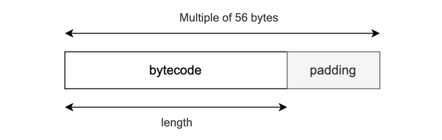The padding procedure used to adjust the original bytecode string to a padded string, that's a multiple of 56 bytes, is as follows: