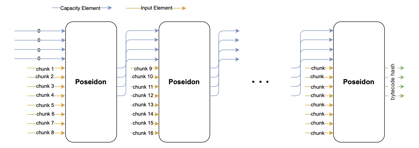 More specifically, the padded bytecode is split into chunks of 7 bytes, and 8 of these chunks are recursively added as input values of the Poseidon hash function.