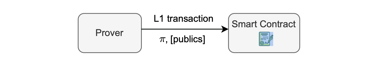 Recall that the prover generates a proof, and sends the proof and an array of public inputs, denoted by [publics]\texttt{[publics]} to the smart contract. The figure below depicts this.