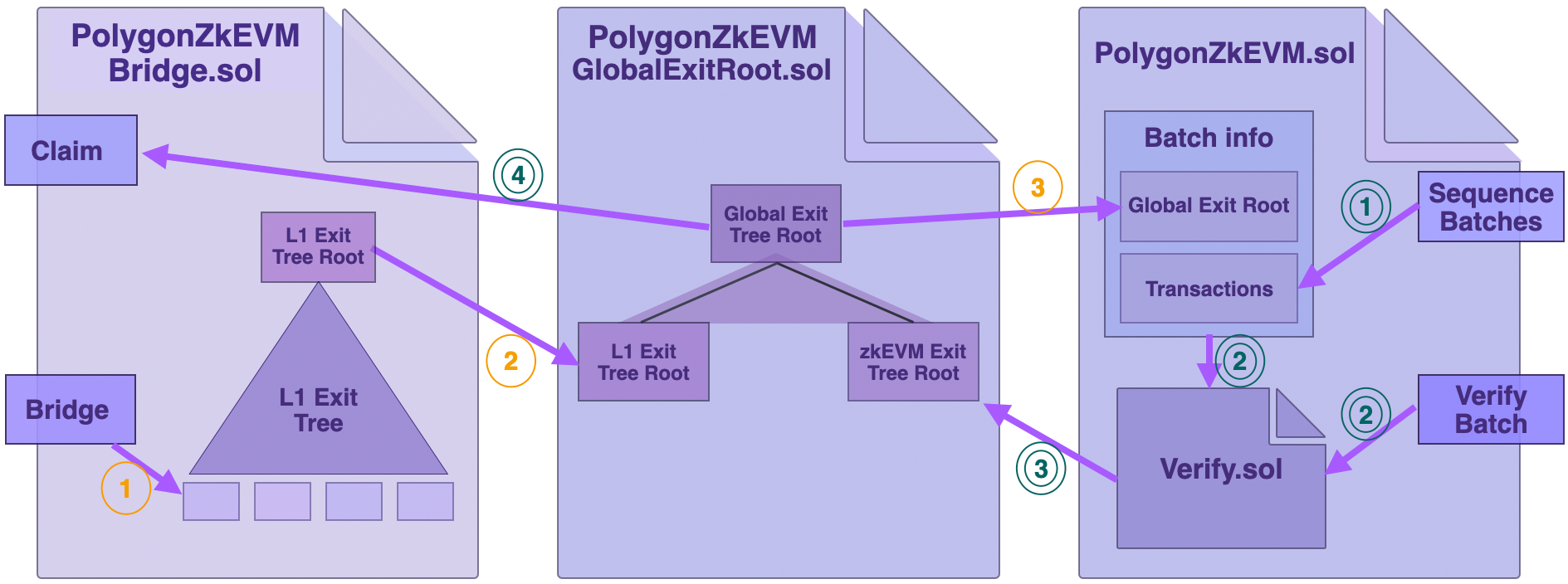 • The global exit root manager contract (PolygonZkEVMGlobalExitRoot.sol), which facilitates synchronization of state-info between the L2 and the L1.
