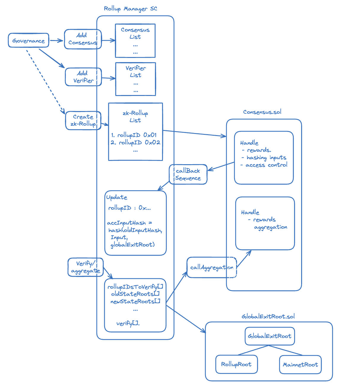 Observe, in the above figure, that the consensus contract (PolygonZkEVMEtrog.sol) is able to: