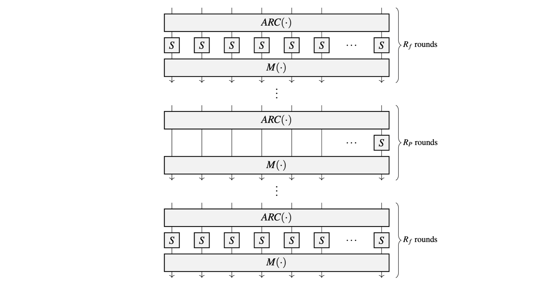 - The S-box function is applied to each element (i.e., to the result of the addition of the round constant), where the first four rounds and the last four of the 30 rounds are full rounds, while the other 22 rounds are partial rounds.