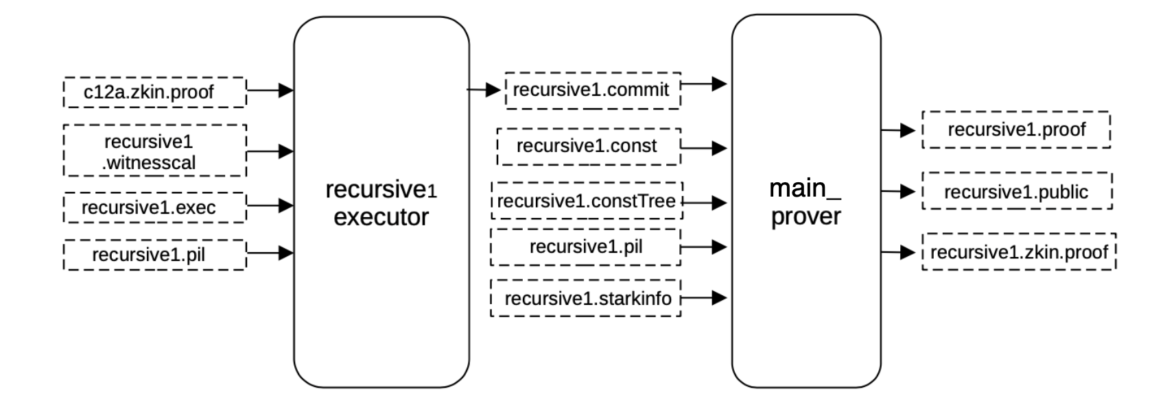 The same main_prover\mathtt{main\_prover} service used previously is applied again here, it again takes as input the previously built constant tree recursive1.constTree and the recursive1.starkinfo file.