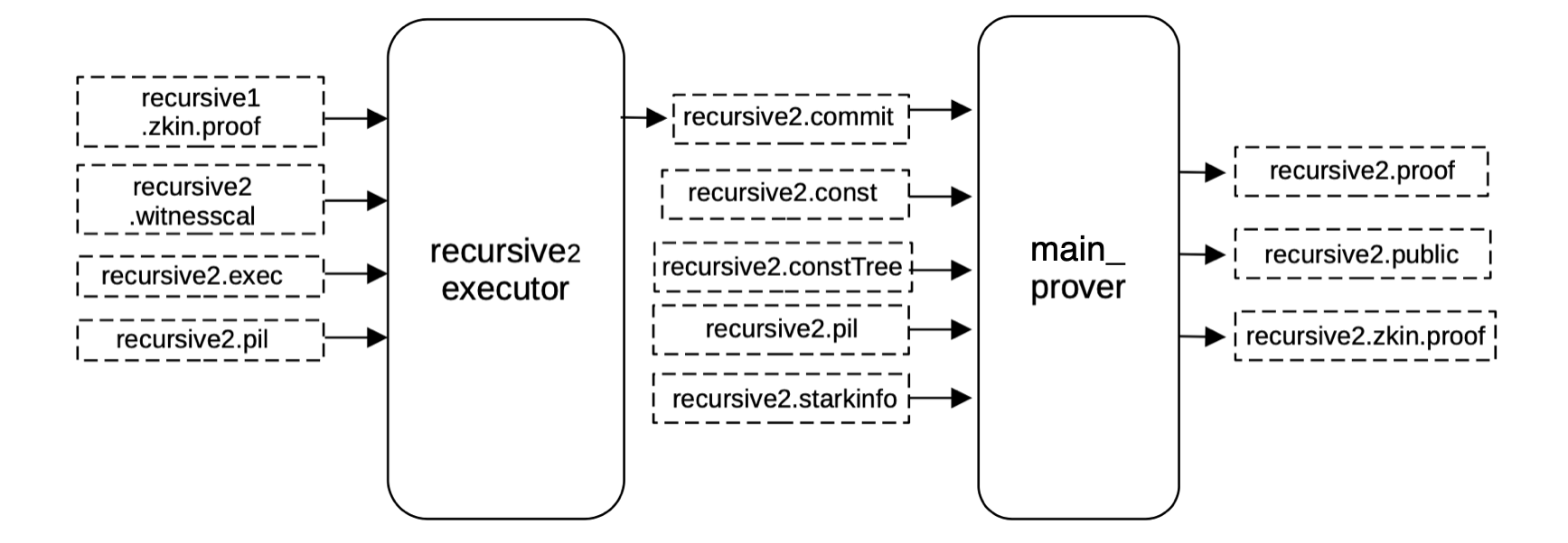 The same service main_prover\mathtt{main\_prover} generates this proof, as it was done before, it takes as inputs the previously built constant tree recursive2.constTree and the recursive2.starkinfo file.