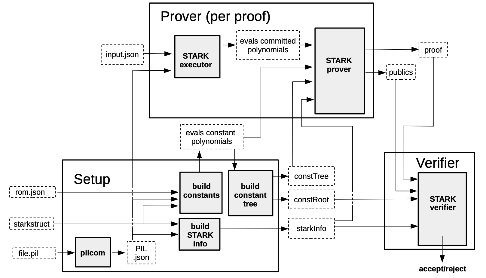 PIL-STARK proof/verification consists of three components; Setup, Prover, and Verifier.