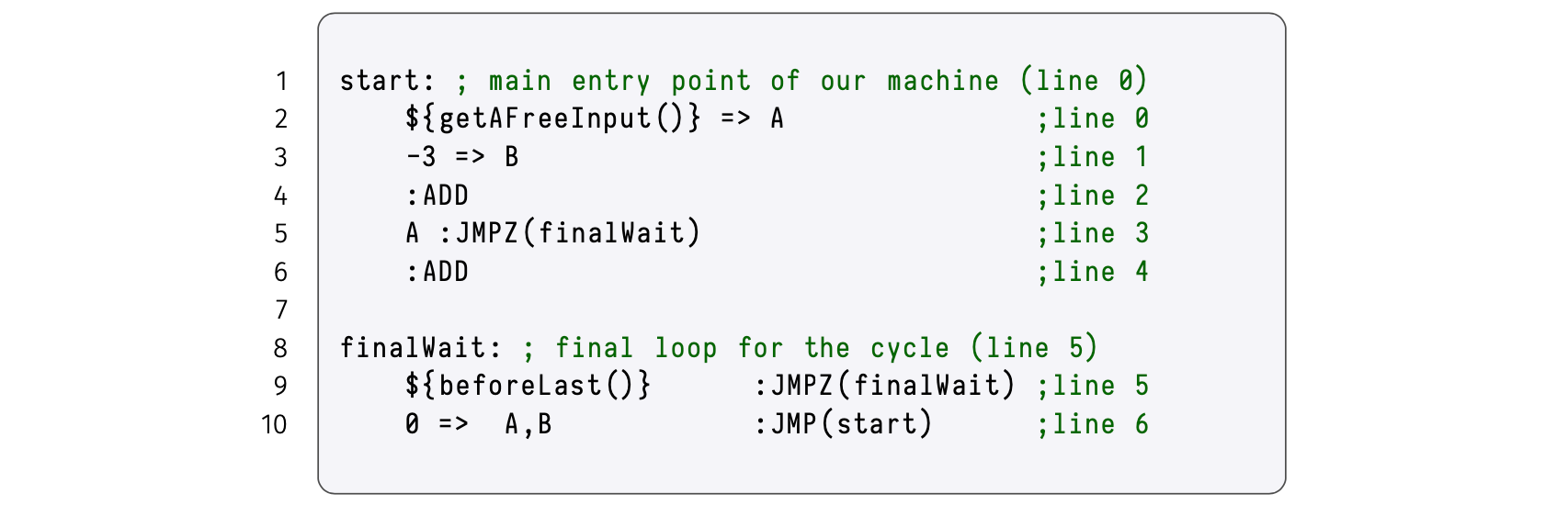 The assembly program uses labels instead of explicit line numbers, hence conforming to how assembly programs are typically written. Labels are convenient because with them, the assembly compiler can take care of computing actual line numbers. For instance, as in Figure 8 below; start\mathtt{start} is line 0\mathtt{0} and finalWait\mathtt{finalWait} is line 5\mathtt{5}.