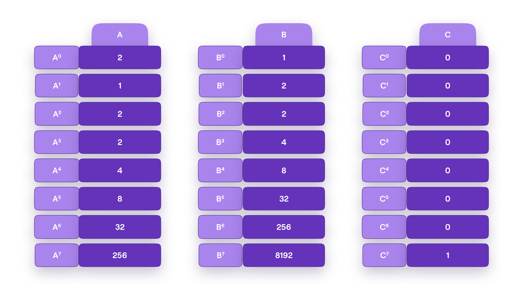 P(ωi)=A[i]        A=[2,1,2,2,4,8,32,256]  Q(ωi)=B[i]        B=[1,2,2,4,8,32,256,8192]\begin{aligned} P(\omega^i) = A[i] \ \ \iff \ \ A = [2,1,2,2,4,8,32,256]\quad\text{ }\text{ } \\ Q(\omega^i) = B[i] \ \ \iff \ \ B = [1,2,2,4,8,32,256,8192] \end{aligned}