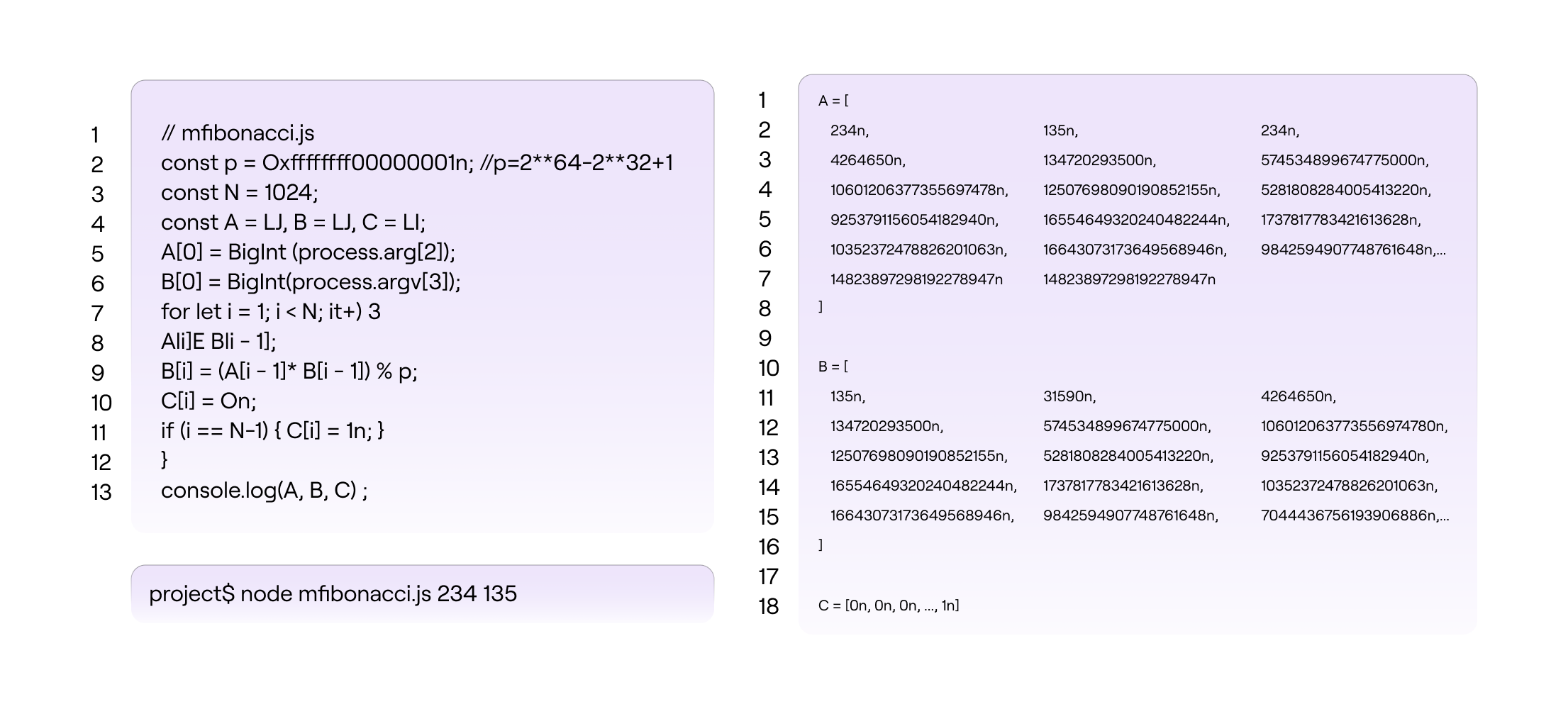 Anyone who knows the three polynomials and the correct initial conditions, say A0=234A_0 = 234 and B0=135B_0 = 135, can simply run the mFibonacci SM code to compute A1023=P(ω1023)A_{\mathtt{1023}} = P(\omega^{\mathtt{1023}}). See below figure for the JS code.