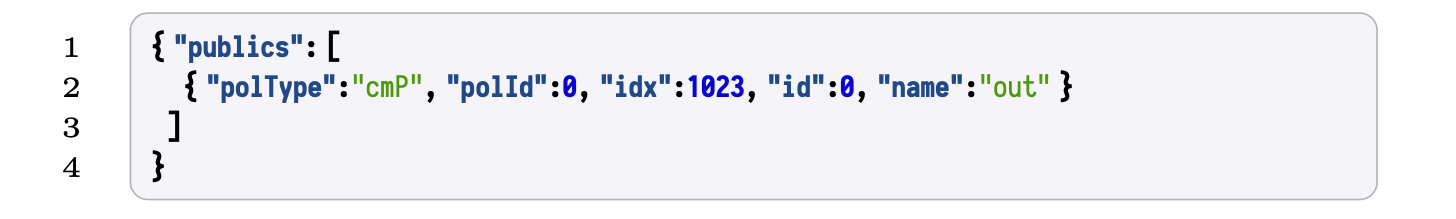 As seen in the description of PIL-STARK, one of the outputs of the SM-prover is the , which are publicly known values. However, looking back at our demonstration, where the file was compiled with , you can notice that the field in the parsed file is empty. Check in the provided snapshot of the "" file, and notice it reads thus: