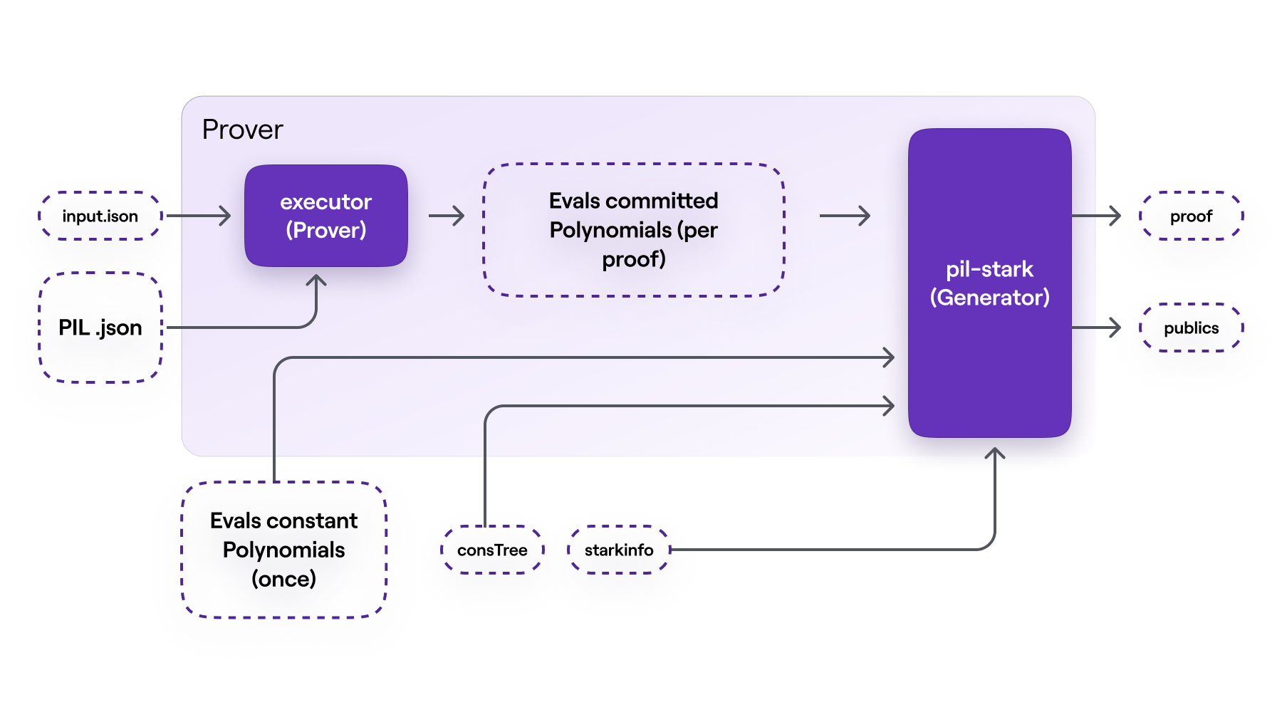 This STARK Proof Generator takes the evaluations of the committed polynomials from the SM-prover's executor, the evaluations of the constant polynomials from the setup phase, together with the and the as inputs.