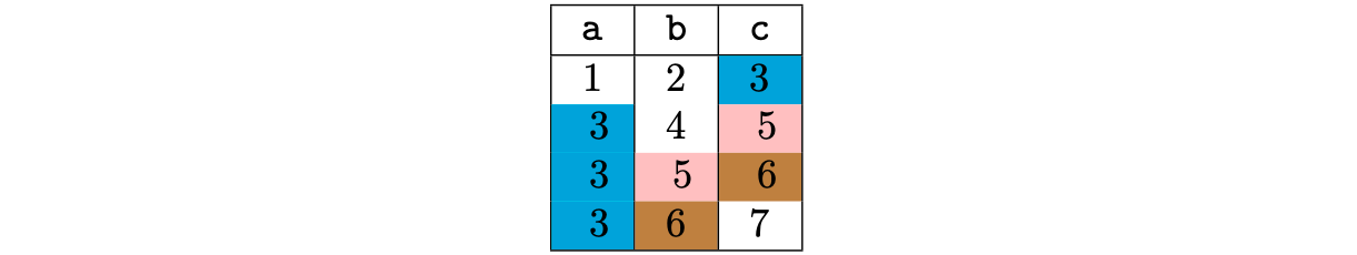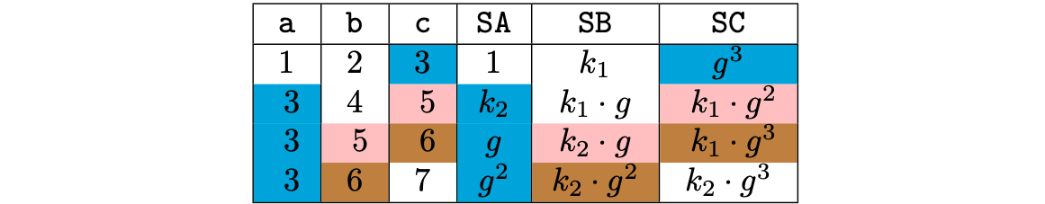 For example, say that we have . Then, the below table depicts an execution trace for three columns that copy-satisfies .